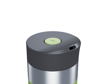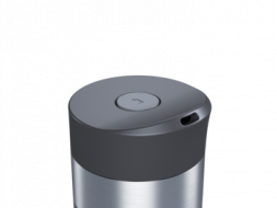 Der Thermobecher kann per Knopfdruck einfach mit einer Hand entriegelt und auch wieder geschlossen werden.